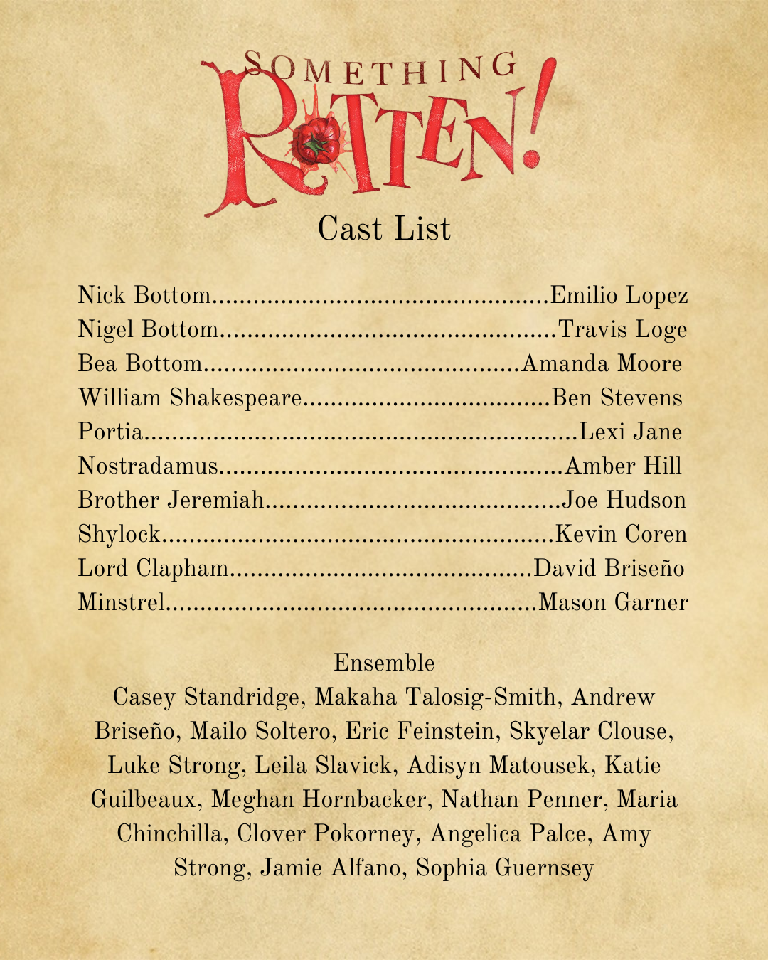 Something Rotten! Is presented through special arrangement with Music Theatre International (MTI). All authorized performance materials are also supplied by MTI. www.mtishows.com